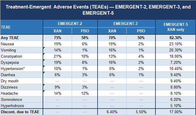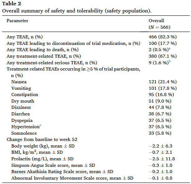 I’ve been saying that Xanomeline is a very average looking antipsychotic in terms of efficacy, but is incredibly attractive when it comes to side-effects: No EPS, no weight gain, no metabolic derangements! My feeling has been that if this continues to be observed in longer-term studies, Xanomeline will probably be an excellent first-line treatment for mild/moderate cases of psychosis (i.e. the ones we use aripiprazole for now). Fortunately for me, EMERGENT-5 is chock-full of “safety data” (i.e. side-effect profiles), so let’s get to it.
