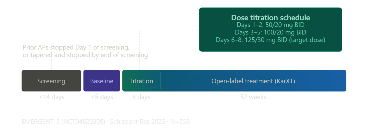 The titration schedule was identical to the acute trials: xanomeline/trospium 50/20mg BID for the first two days, 100/20mg BID on days 3-7, then flexible dosing up to a maximum of 125/30mg BID starting on day 8, with the option to return to 100/20mg based on tolerability.